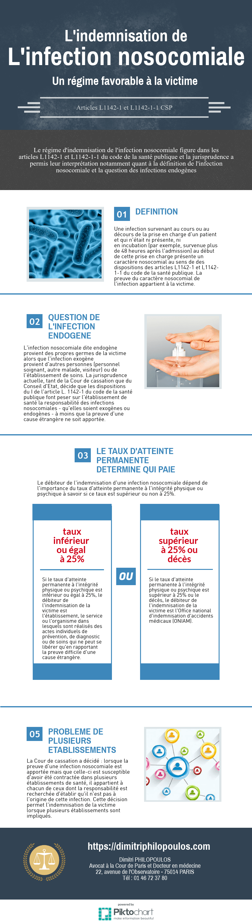 L'infection nosocomiale dite endogène provient des propres germes de la victime alors que l'infection exogène provient d'autres personnes (personnel soignant, autre malade, visiteur) ou de l'établissement de soins. La jurisprudence actuelle, tant de la Cour de cassation que du Conseil d'Etat, décide que les dispositions du I de l'article L. 1142-1 du code de la santé publique font peser sur l'établissement de santé la responsabilité des infections nosocomiales - qu'elles soient exogènes ou endogènes - à moins que la preuve d'une cause étrangère ne soit apportée.